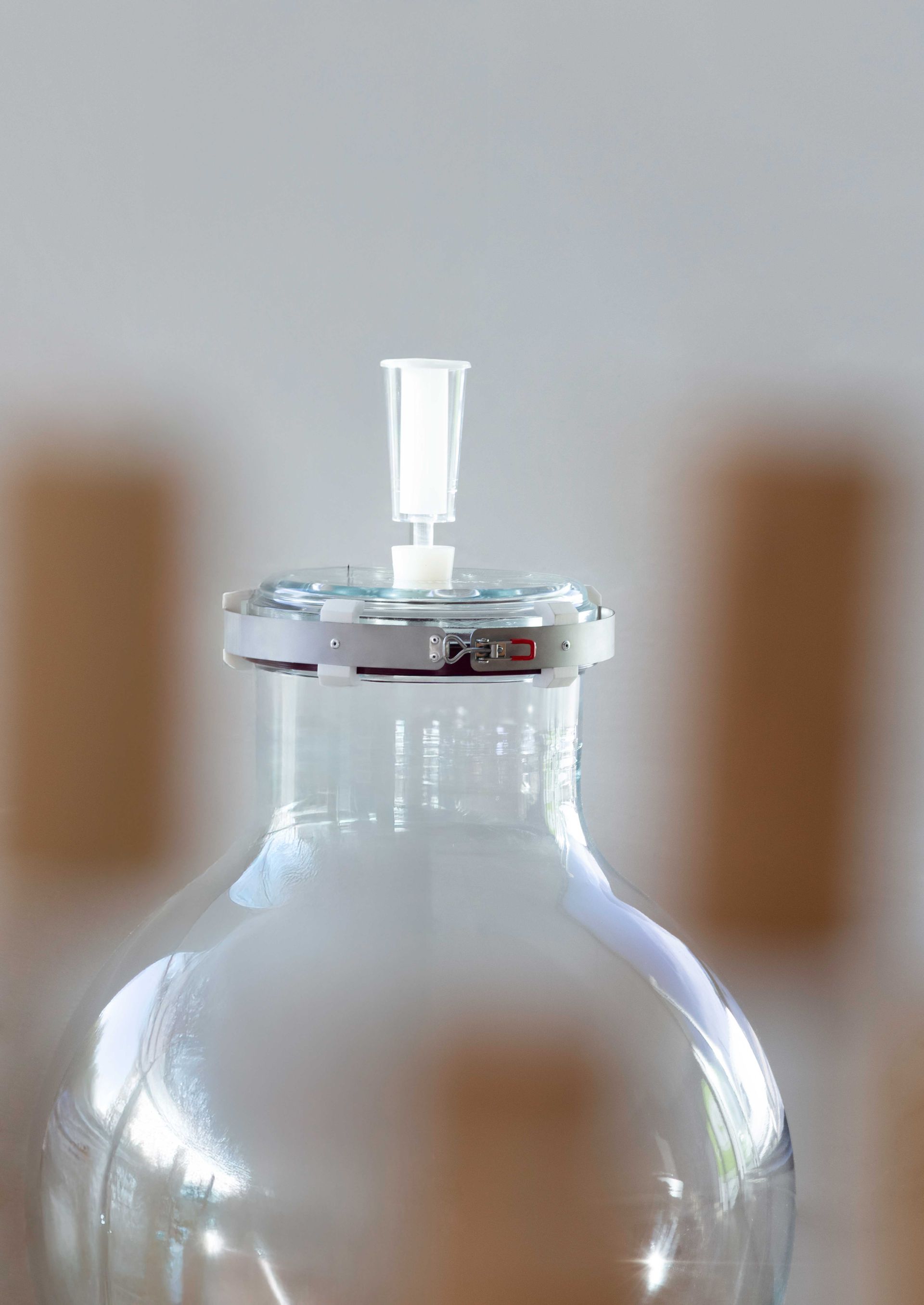 La claridad del vidrio permite un control visual constante del proceso, facilitando el seguimiento de fermentaciones, maceraciones o reposos sin necesidad de abrir el recipiente ni intervenir en el contenido.